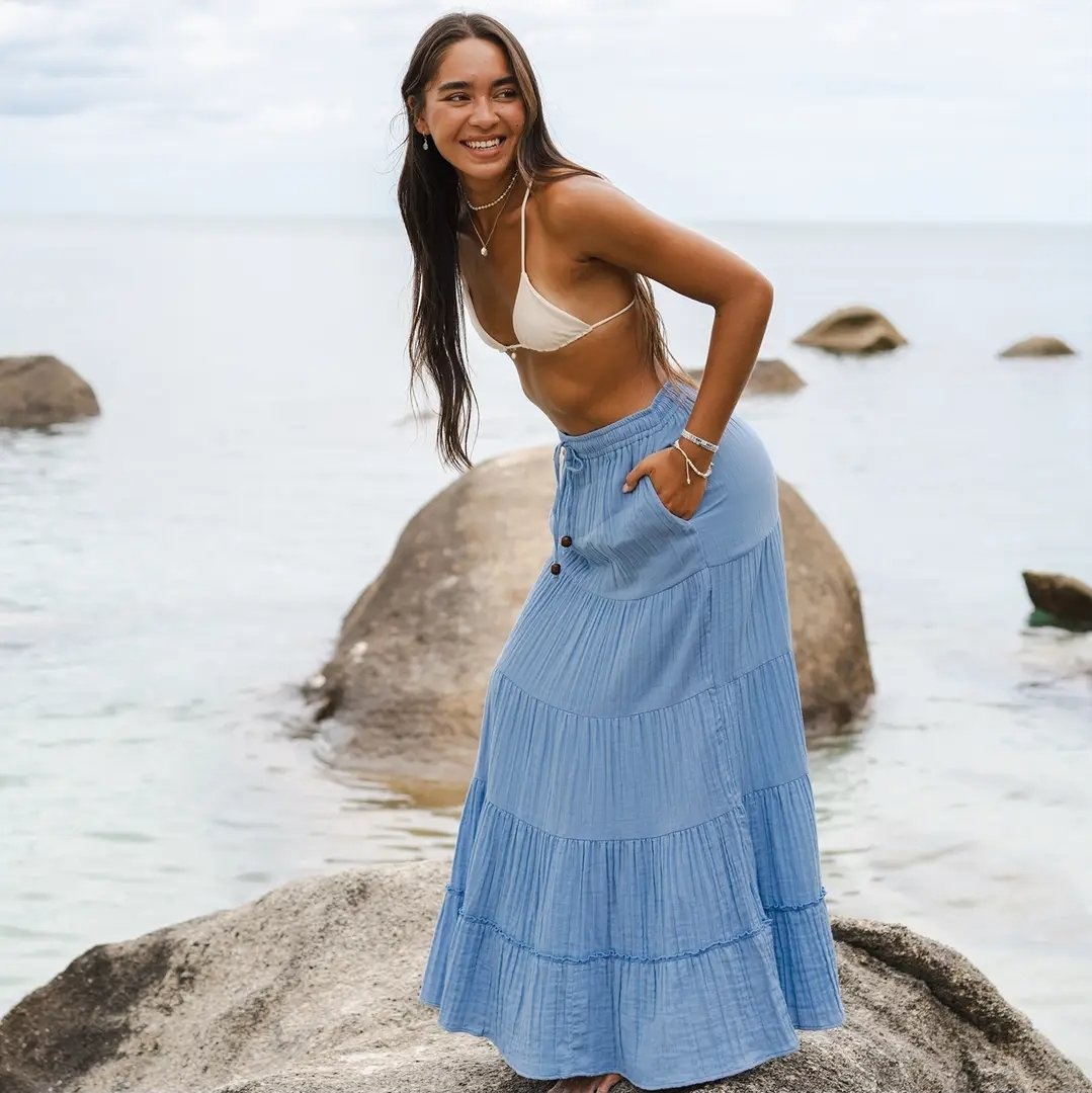 Indulge in island-inspired vibes with our tiered cotton skirt! Complete with a drawstring waist and convenient interior pockets, this skirt is your passport to easy going style. Get the beach look and pair it with a crochet top, or elevate the charm with our ponchos.
